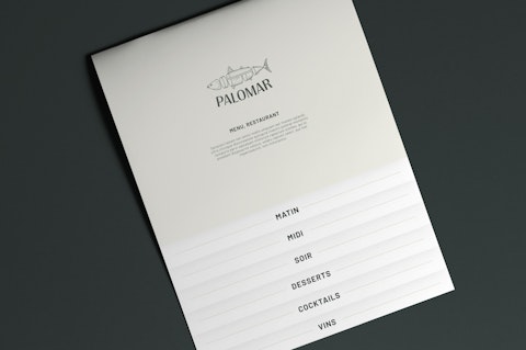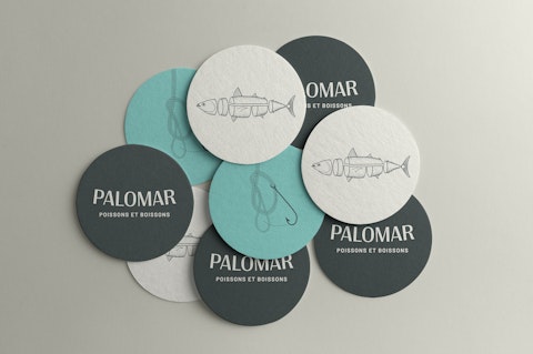 Pour la création de cette identité de marque, il était essentiel d'évoquer la mer et le métier de poissonnier. On tenait aussi à chasser les idées préconçues à propos du poisson vieilli à sec et à démystifier le processus d'affinage, bien connu en boucherie. Le mot palomar désigne un nœud couramment utilisé dans le monde de la pêche. Par sa sonorité, le nom rappelle la beauté de la mer et l’esprit des vacances. Au cœur de l'identité visuelle de Palomar, un poisson entier, découpé comme une viande symbolise le processus de transformation et d'affinage. Cette illustration représente l'attention portée aux détails et à la qualité des produits offerts par Palomar. Sobre, simple et délicate, la typographie choisie pour le logo incarne l'élégance et la finesse de l’établissement. Côté couleurs, on a opté pour un bleu frais qui évoque la mer et la fraîcheur des produits et un vert très foncé, tirant sur le charbon, pour rappeler les qualités marines et ajouter une touche de sophistication. Cette palette reflète l'authenticité et la qualité des produits de la mer proposés par la poissonnerie-buvette.